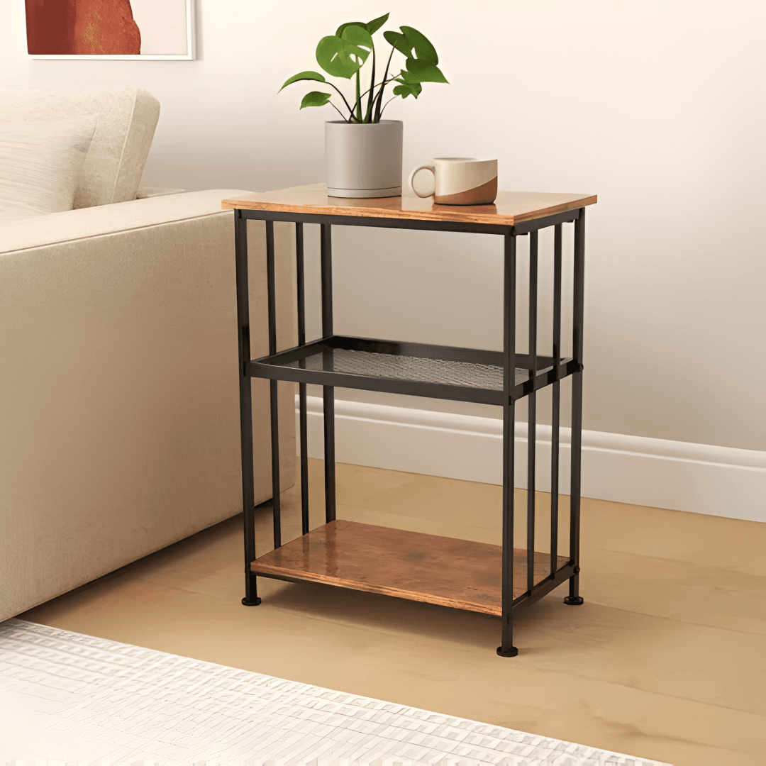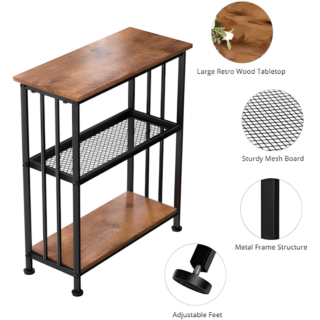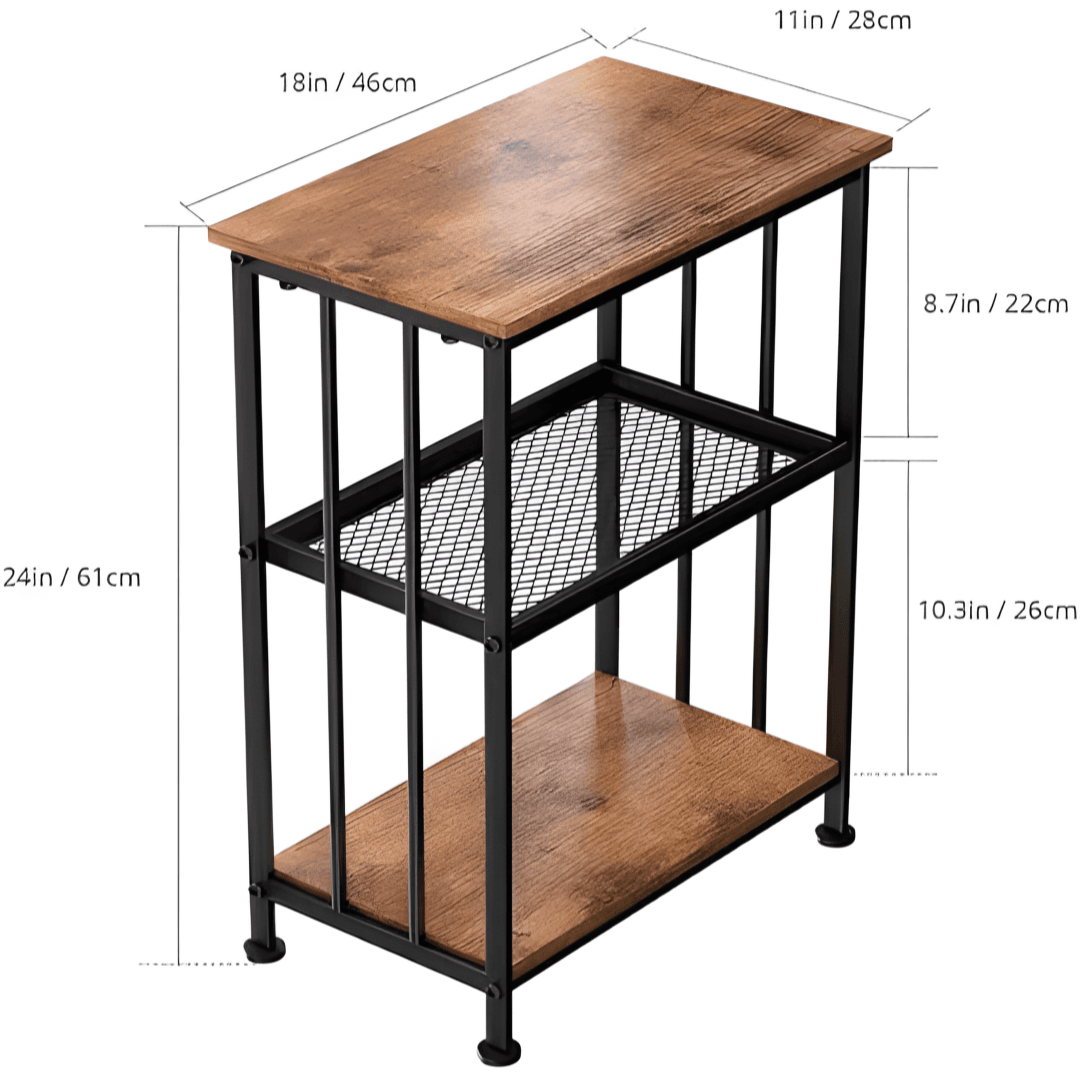 Its compact size (24x18x11 inch) fits perfectly beside your sofa, bed, or in the corner of your kitchen, providing space for lamps, books, décor, or appliances. The top wooden surface offers a rustic charm, while the mesh middle shelf and lower wooden tier ensure strength and style.