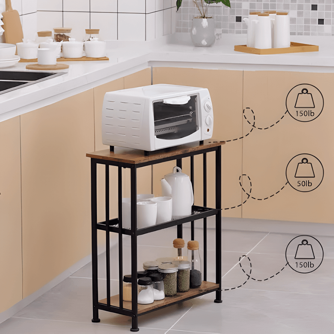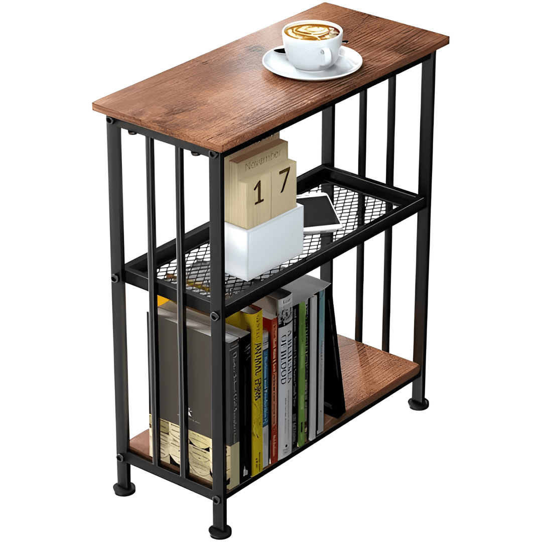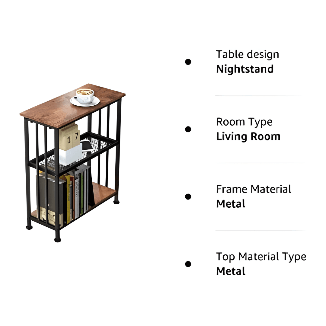 Its compact size (24x18x11 inch) fits perfectly beside your sofa, bed, or in the corner of your kitchen, providing space for lamps, books, décor, or appliances. The top wooden surface offers a rustic charm, while the mesh middle shelf and lower wooden tier ensure strength and style.