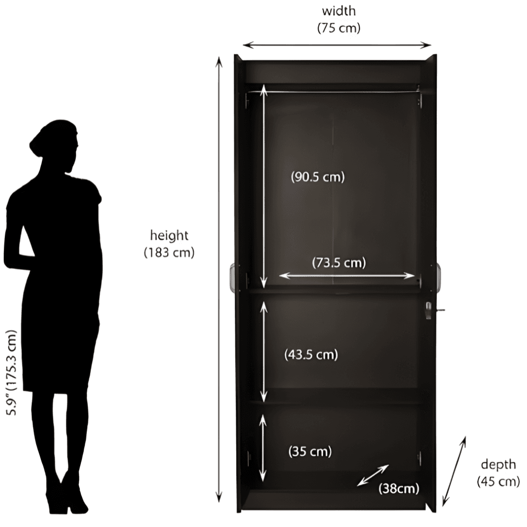 At the bottom, a 35 cm (height) × 38 cm (depth) storage compartment is perfect for keeping bags, shoes, purses, and travel essentials. The wardrobe has a total height of 183 cm, width of 75 cm, and depth of 45 cm, making it perfect for both small and spacious rooms.