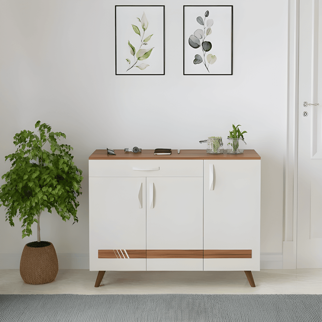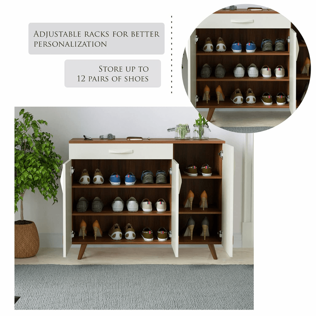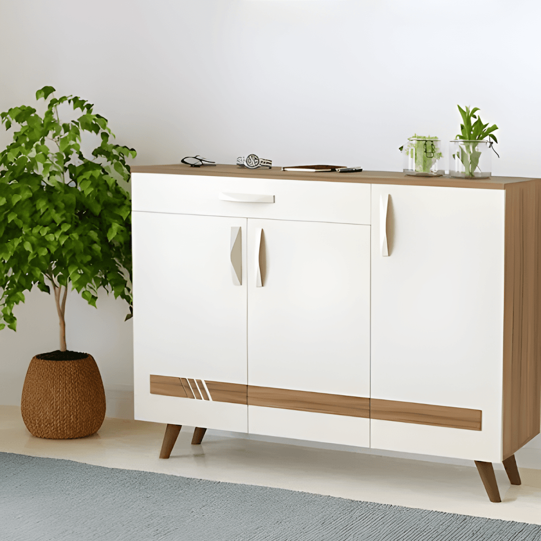 Transform your entryway with this modern shoe storage cabinet, designed for both style and practicality. Crafted with a clean white and walnut wood finish, this shoe cabinet blends seamlessly into any home décor, from minimalist to contemporary interiors.